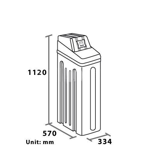 * Capacità di interscambio: 140ºHFxm3 * Consumo sale a rigenerazione: 4,1 kg/salt. * Consumo acqua a rigenerazione: 225 lt. * Quantità acqua trattata per rigenerazione, 35°F-4,000m3, 40°F-3,500m3, 45°F-3,111m3, 50°F-2,800m3, 60°F-2,333m3. * Portata di lavoro: 0,8 m3/h * Portata max.: 1,2 m3/h * Ingresso/Uscita acqua: 1″ * Dimensioni mm (LxPxH): 334x570x1120